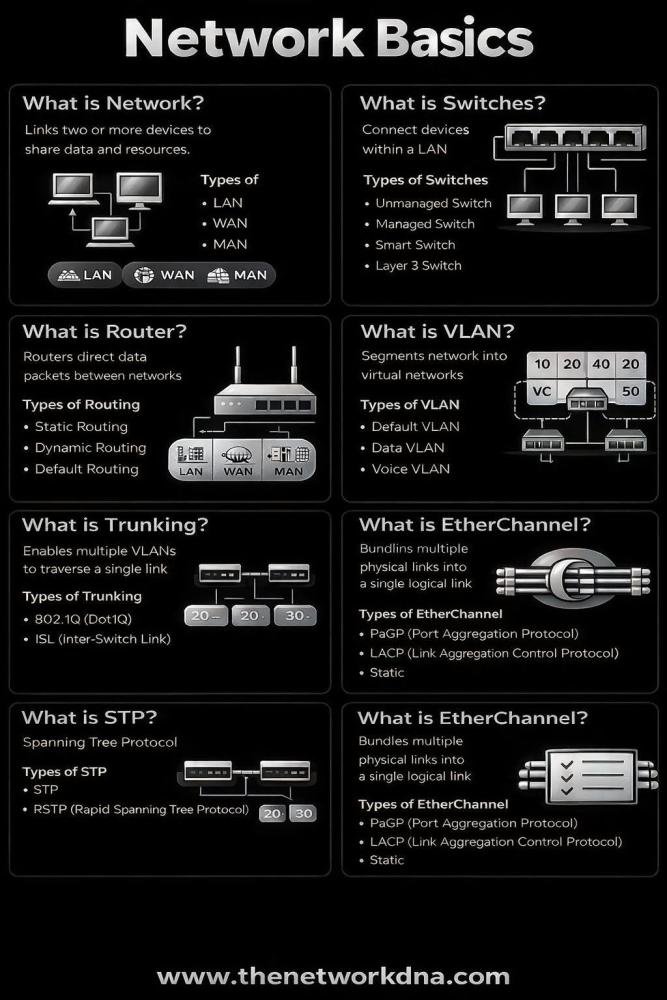 If you're starting your journey in Networking, CCNA, or Cybersecurity, understanding these core concepts is essential. This quick guide covers some of the most important building blocks of modern networks.