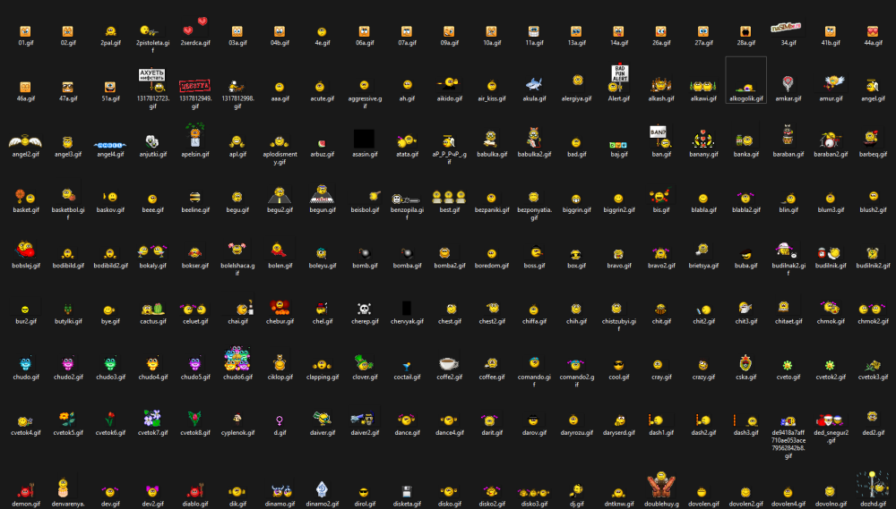 The set contains 950 emoticons (Actions, Good and Evil, Fights and Weapons, Madhouse, Food and Drinks, Gestures, Animals, Icons and Inscriptions, Love, Music, Holidays, Characters, Miscellaneous, Family, Sports, Sports, Technology, Flowers, Emotions, General, Sex, Square)