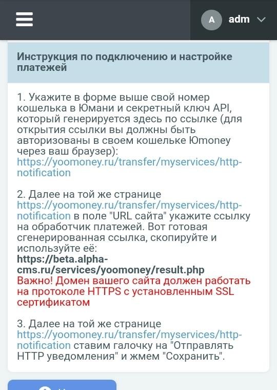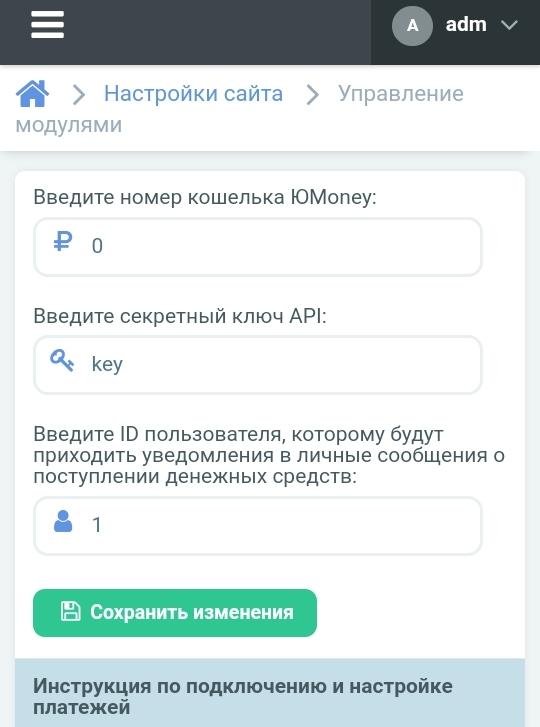 After installation, go to the control panel > site settings > module management > Accept payments via YuMoney and configure the connection of your wallet to accept automatic payments.