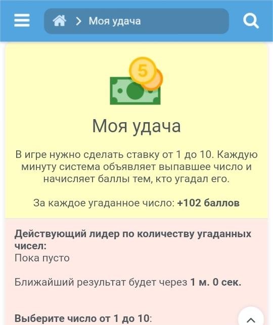 In the game, you need to place a bet from 1 to 10. Every minute, the system announces the number that has been guessed and awards points to those who guessed it. For each number guessed: +100 points.