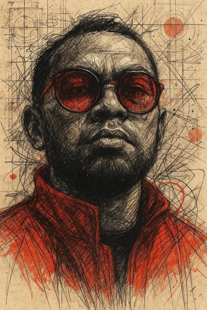 Composition should be centered, chest-level up (shoulders slightly visible), with the head dominating the . The final piece should feel like a modern street-art poster meets fine-art sketchbook portrait"