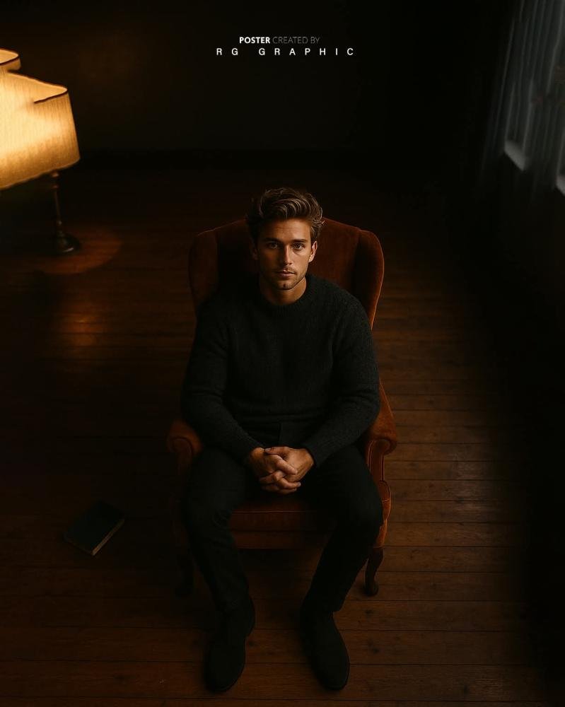 Use a neutral with confidence, no smile — just calm strength and a sense of stylish boldness.